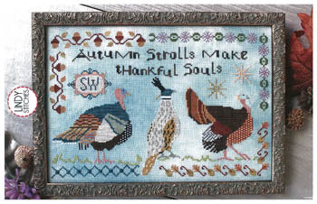 Autumn Strolls Features the sentiment "Autumn strolls make thankful souls" Model: stitched on 36ct linen or aida of your own choice Stitch count: 185w x 125h |