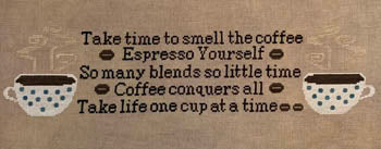 Coffee Break "Take time to smell the coffee. Espresso yourself. So many blends, so little time. Coffee conquers all. Take life one cup at a time." Stitch Count: 258W x 63H |