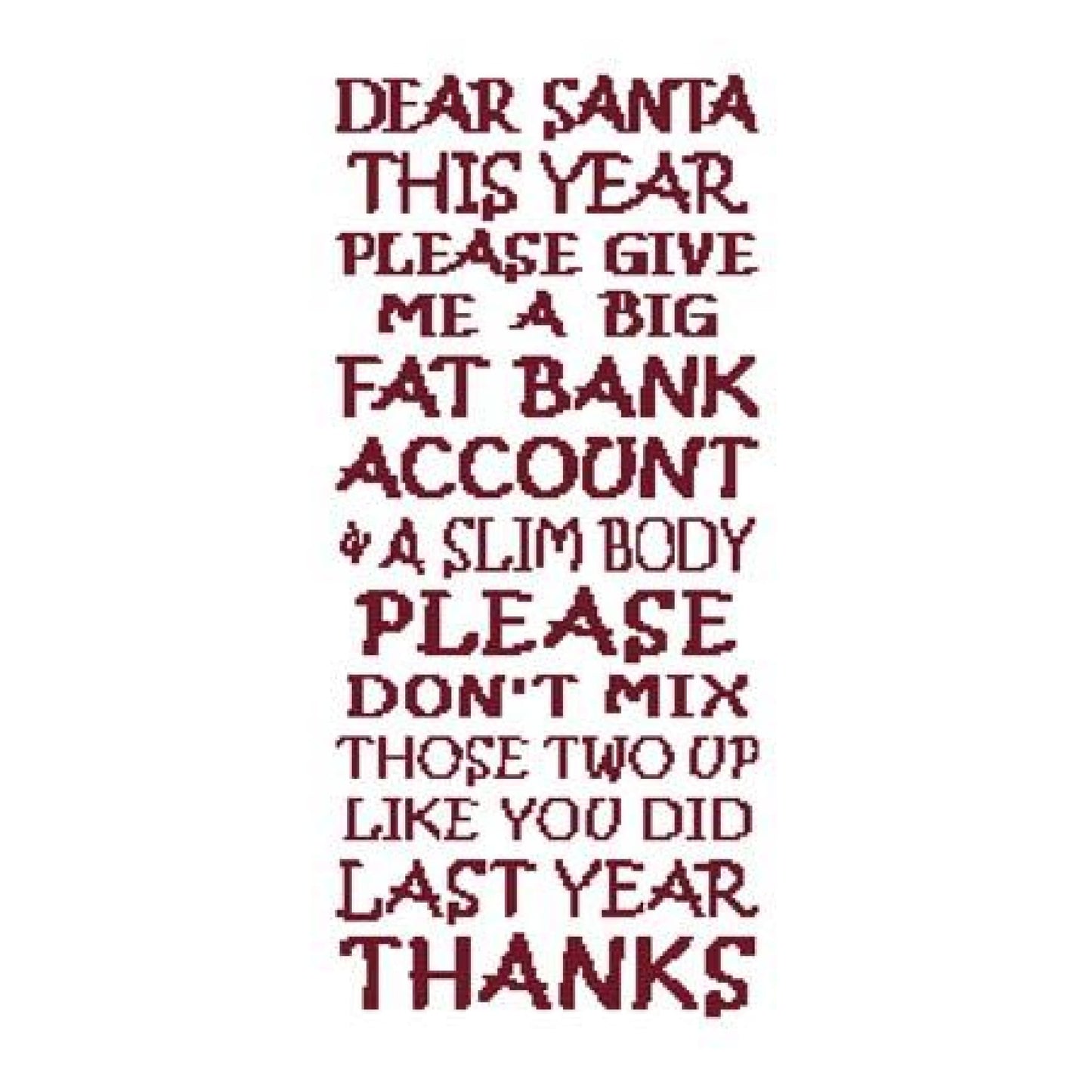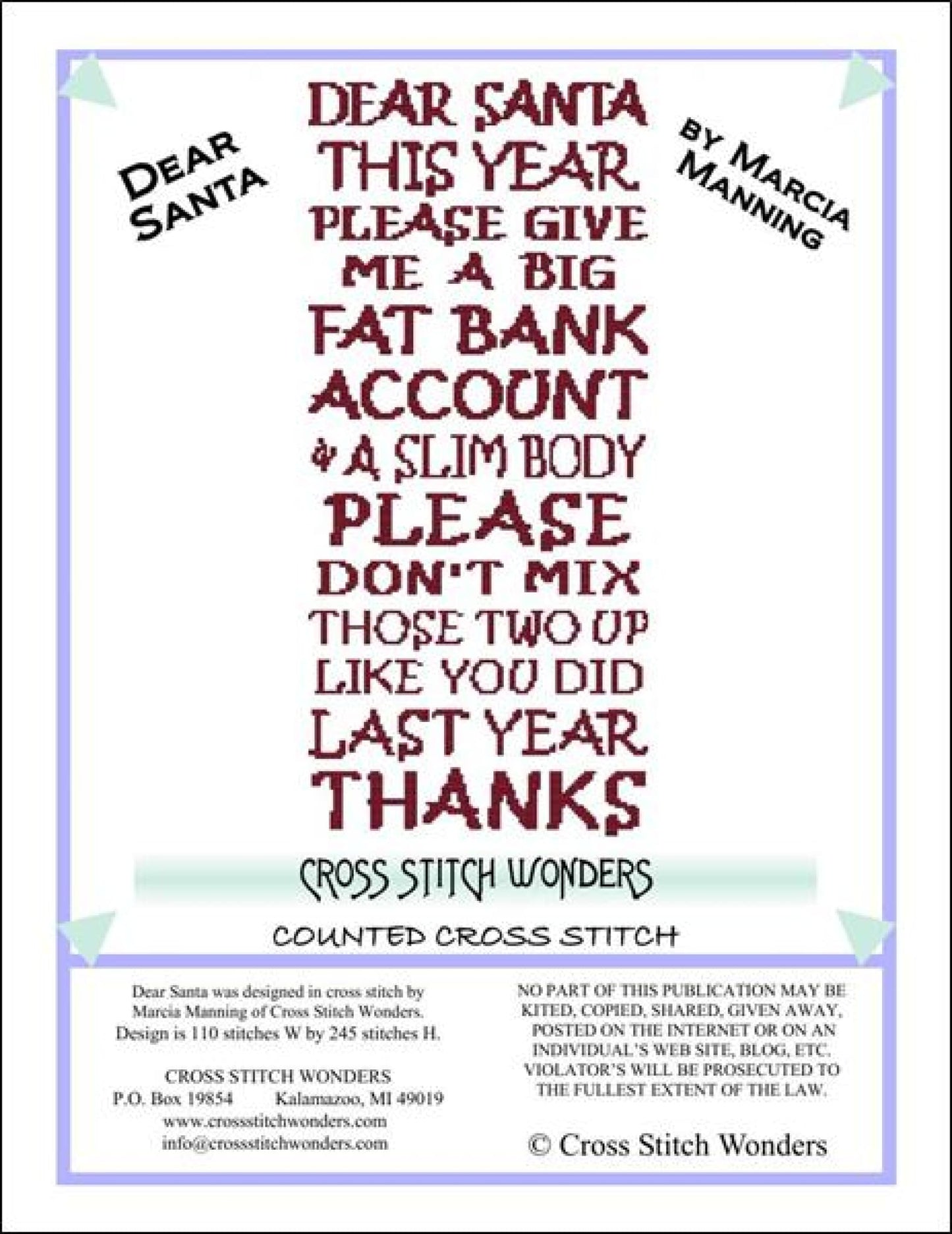 Dear Santa A Great Christmas Saying Design in Counted Cross Stitch. Design is all full cross stitches. Stitch Count: 110w x 245h |