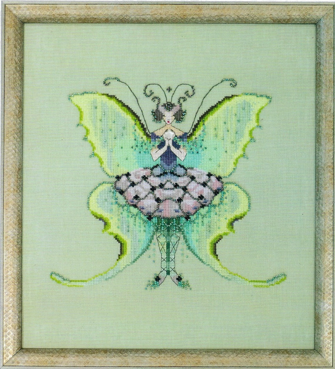 Luna Moth, NC311 Fluttering Fashion series Model: stitched on 32/16ct Water Lily fabric Mill Hill beads required: 00283, 02008, 02070, 03002 DMC floss required: 15, 25, 31, 32, 159, 160, 501, 502, 503, 535, 580, 704, 819, 844, 945, 951, 955, 962, 964 |