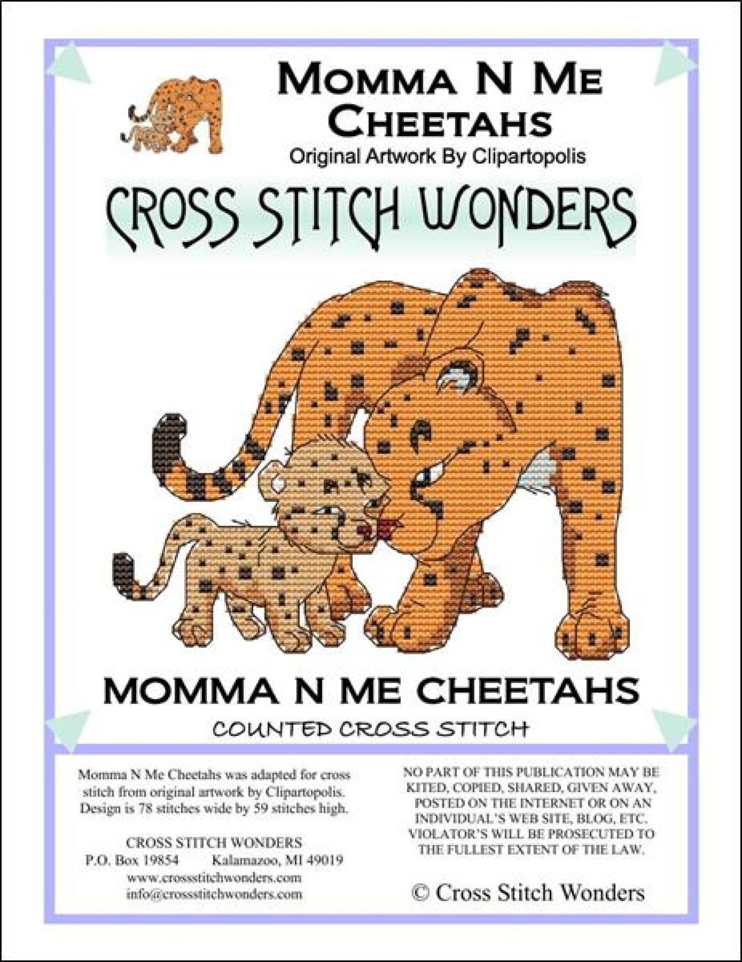 Momma N Me Cheetah A wonderful Momma N Me Cheetah Design! Original artwork by Clipartopolis. Stitch Count: 78w x 59h |