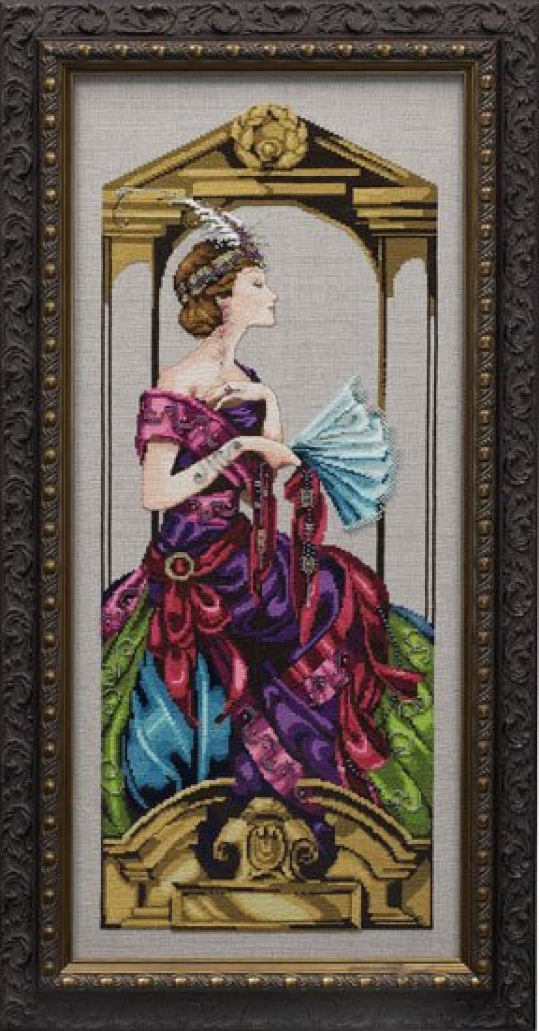 Venetian Opulence, MD99 This classical lady is wrapped in sumptuous jewel toned silks while cascading ribbons flow around her among graceful arches and carved columns or Baroque Italy. Model: stitched on 32 Ct. Natural Brown linen Stitch Count: 140W x 347H Mill Hill Beads required: 02070, 02077, 03026, 03037 (2), 16609, 18027 DMC Floss required: White, 154, 326, 356, 433, 434, 469, 550, 552, 601, 603, 632, 680, 718, 729, 754, 758, 781, 814, 828, 869, 906, 907, 915, 926, 927, 934, 938, 939, 948, 964, 3046, 3371 (2), 3787, 3805, 3806, 3808, 3809, 3849 |