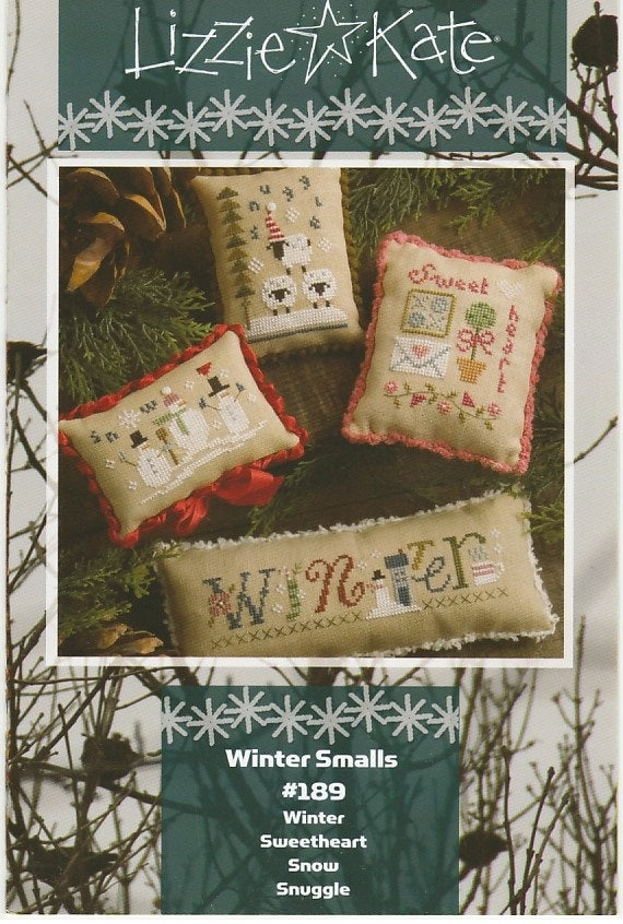 Winter Smalls, LK189 Models: were stitched on 32ct Natural Light linen Stitch Count: "Winter" 94W x 22H, "Sweetheart" 36W x 49H, "Snow" 51W x 29H, "Snuggle" 35W x 51H |