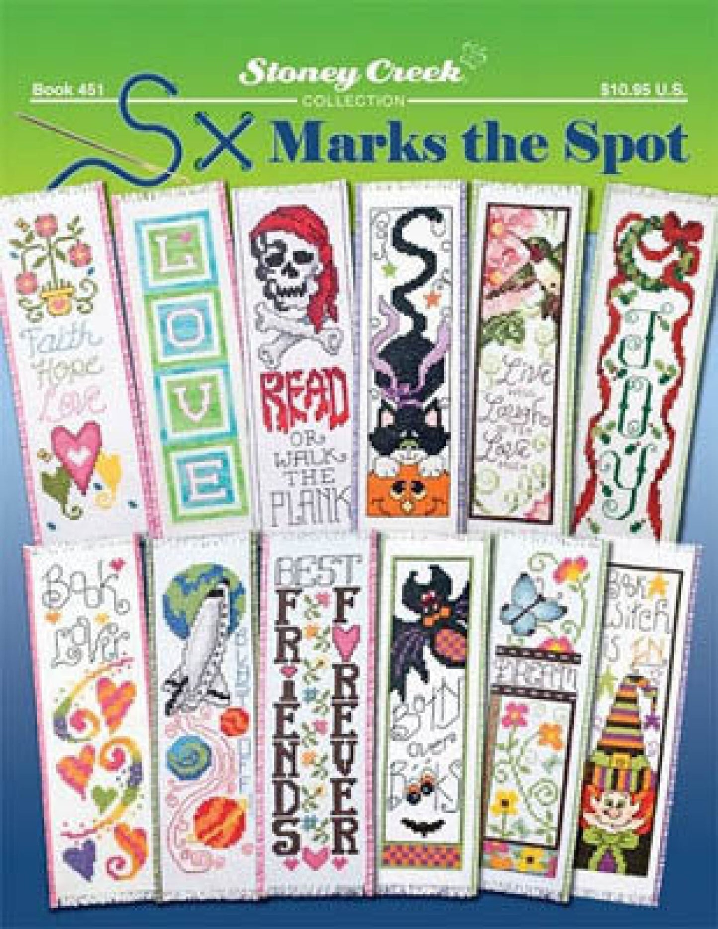 12 Bookmark patterns Models: stitched on Stoney Creek 14ct bookmarks using DMC floss and Stoney Creek buttons. |